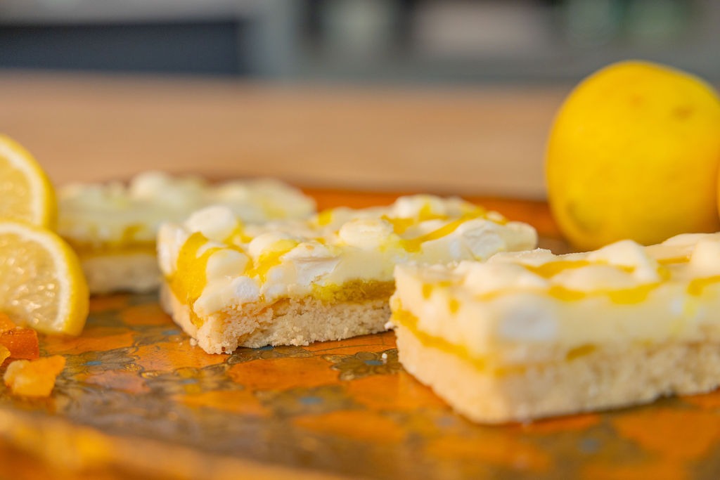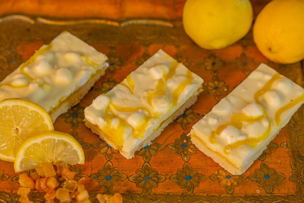 White Chocolate Flavour Coating (30%) (Sugar, Palm Oil, Whey Powder (MILK), Emulsifier (Lecithins), Natural Flavouring), Lemon Flavour Curd (20%) (Glucose-Fructose Syrup, Sugar, Water, Margarine (Palm Oil, Rapeseed Oil, Water, Palm Stearin), Cornflour, Acidity Regulators (Citric Acid, Trisodium Citrate), Dried Whole EGG, Gelling Agent (Pectin), Colours (Lutein, Curcumin), Natural Flavouring), Wheat Flour (WHEAT Flour, Calcium Carbonate, Iron, Niacin, Thiamin), Meringue (9%) (Sugar, EGG Albumen, Palm Fat, WHEAT Starch), Margarine (Vegetable Oils (Palm, Rapeseed), Water, Salt, Emulsifier (Mono- and Diglycerides of Fatty Acids)), Butter (MILK), Caster Sugar, Cornflour, Marshmallows (1%) (Glucose-Fructose Syrup, Sugar, Water, Pork Gelatine, Anti-Caking Agent (Maize Starch), Natural Flavouring), Salt.